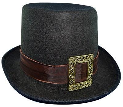 Black felt top hat with ribbon an buckle. Great for steampunk.