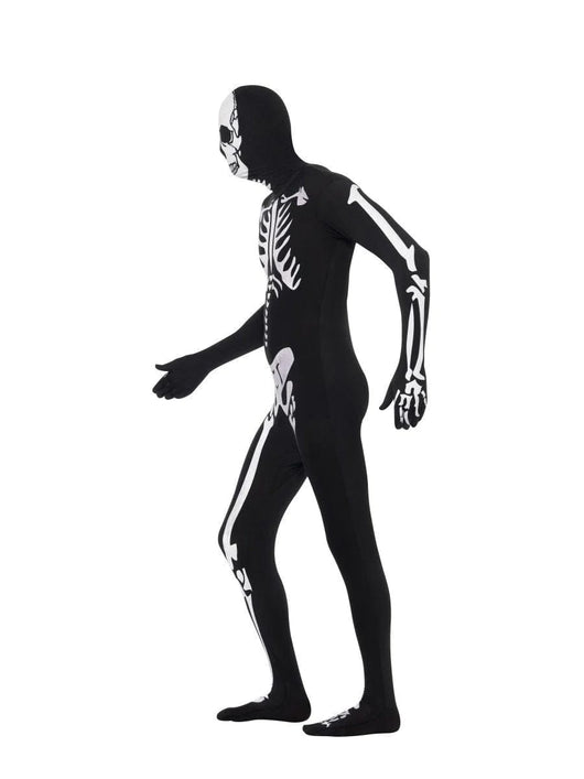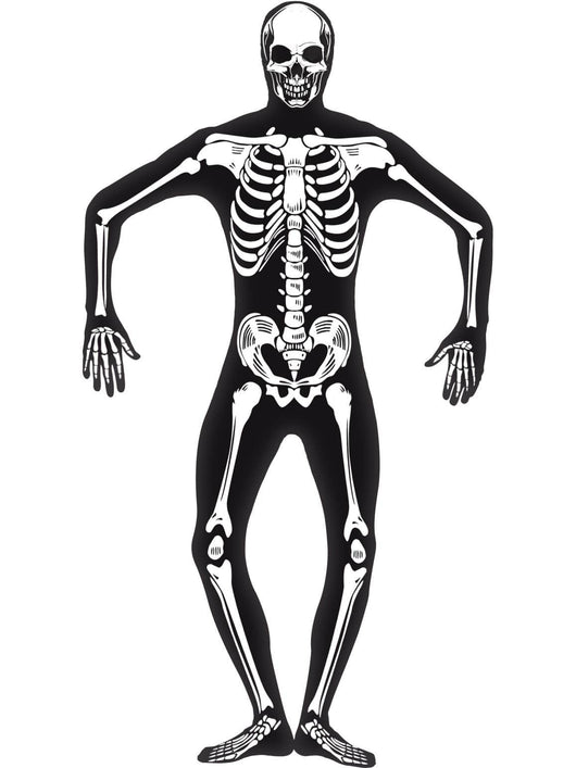This Skeleton Halloween Costume Skin Suit is sure to complete your spooky look this Halloween. It features a black skeleton second skin costume, concealed fly, under chin opening, and glow-in-the-dark accents that provide an extra-creepy experience. Enjoy a comfortable and authentic Halloween costume with this skeleton skin suit.