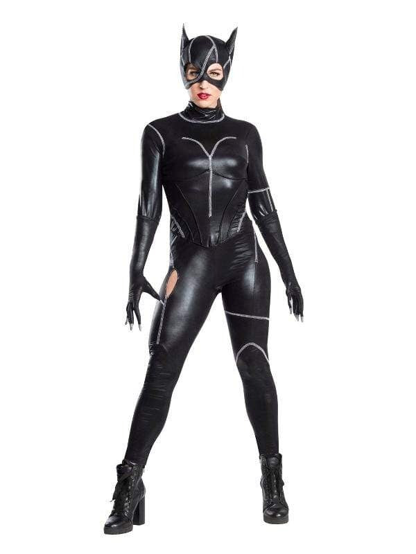 Rock this bodacious bodysuit--complete with over-lock stitching and Velcro closures--to become the purr-fectly powerful Catwoman! Paired with leather-look elbow-high gloves and soft cat claws, you'll look dangerously cute. And don't forget your foam-backed eye-mask, featuring those oh-so-adorable ears! (Shoes not included.) Now you're ready to conquer the world--or at least the Halloween party--in your officially licensed DC Comics Catwoman Costume Stitch!