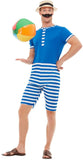 Blue and white 1920's Bathing suit. Turn up in this costume for a pool or roaring 20's party.