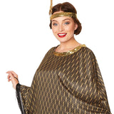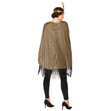 1920s Black and Gold Flapper poncho in Art Deco style print with gold sequin trim and long black fringing. This 20s poncho can be worn with leggings or pants as your complete costume or as an accessory to add to your Flapper outfit. Many women prefer to cover their arms and this is the perfect 20's style costume to do just that. Poncho has gold sequin trim at neckline and comes with matching stretch gold sequin headband with feather. This is the ultimate easy dress up. Just throw it on and walk out the door ready for a fabulous time at your Gatsby themed party.