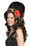 The shortcut to Amy Winehouse's signature hairstyle. This wig is brown, silky and lightly curled with blonde highlights, styled into a beehive and accented with a red rose.