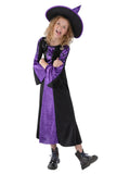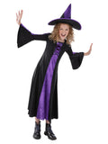 Classic witch costume for girls at Halloween. Bewitched Witch costume includes stretch black dress with crushed velvet purple panels, sequin lace up at front and matching hat. Make-up and all other accessories sold separately.