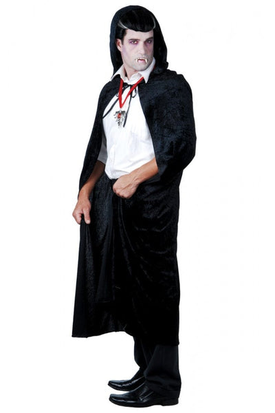 Black velveteen hooded cape. Long black cape with attached black hood. Ties up at front. The perfect cape to complete your Halloween costume. Wear it with a Plague Doctor mask or add a Skull Mask for the Grim Reaper. Also the perfect accessory for Medieval costumes.