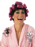 • Black curly wig made from polypropylene hair strands and attached plastic pink curlers