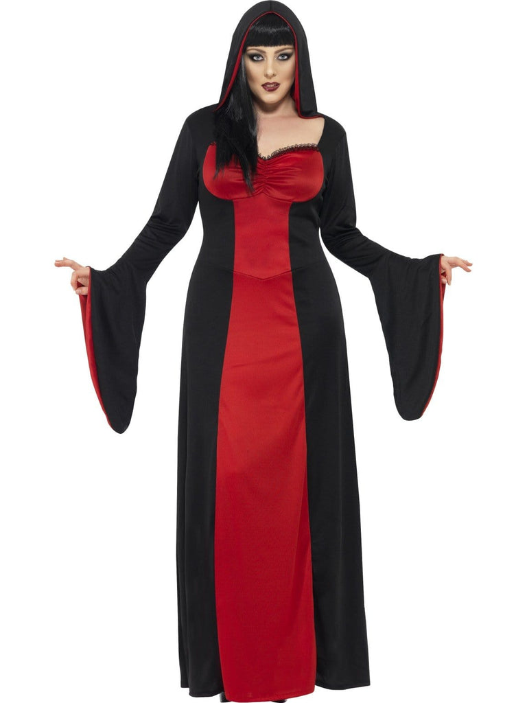 This Dark Temptress Plus Size Costume is the perfect way to make an entrance this Halloween. The stunning Red dress and hood will bring your gothic look to life and ensure you stand out in any crowd. Make sure to add this costume to your list of must-haves for Halloween.