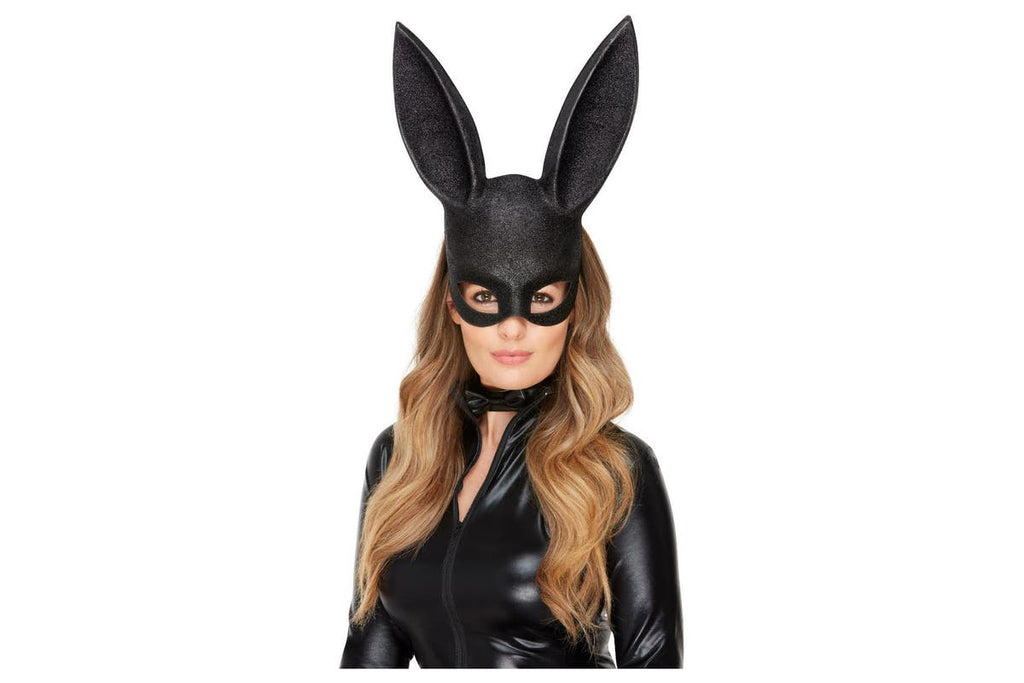 Seductive Black Bunny Kit includes bunny mask with tall ears in black glitter and black shiny bow tie collar. Complete your sexy bunny look with wet look black jumpsuit. Also perfect for dressing up as pop star Ariana Grande. Lightweight mask.