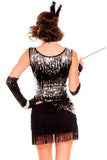 Shimmer and shine in this Gatsby Flapper dress. Costume includes asymmetrical silver and black sequin fringed dress and cigarette holder. Headband, gloves, beads and hosiery sold separately. (Bag not included)