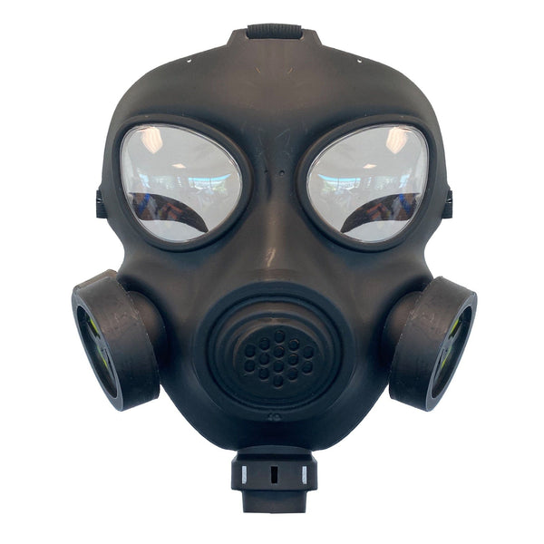 Military style costume gas mask. Perfect for Halloween or armageddon. Whichever comes first? Black plastic mask with clear lenses and elastic strap for comfortable fit around head. Matches perfectly with our Quarantine Jumpsuit costume. Please note: this is a pretend gas mask for dressing up. It is not functional.