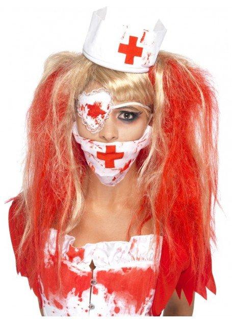 Bloody nurse kit includes mask, headband and eye patch covered with fake blood. Dress and wig sold separately.