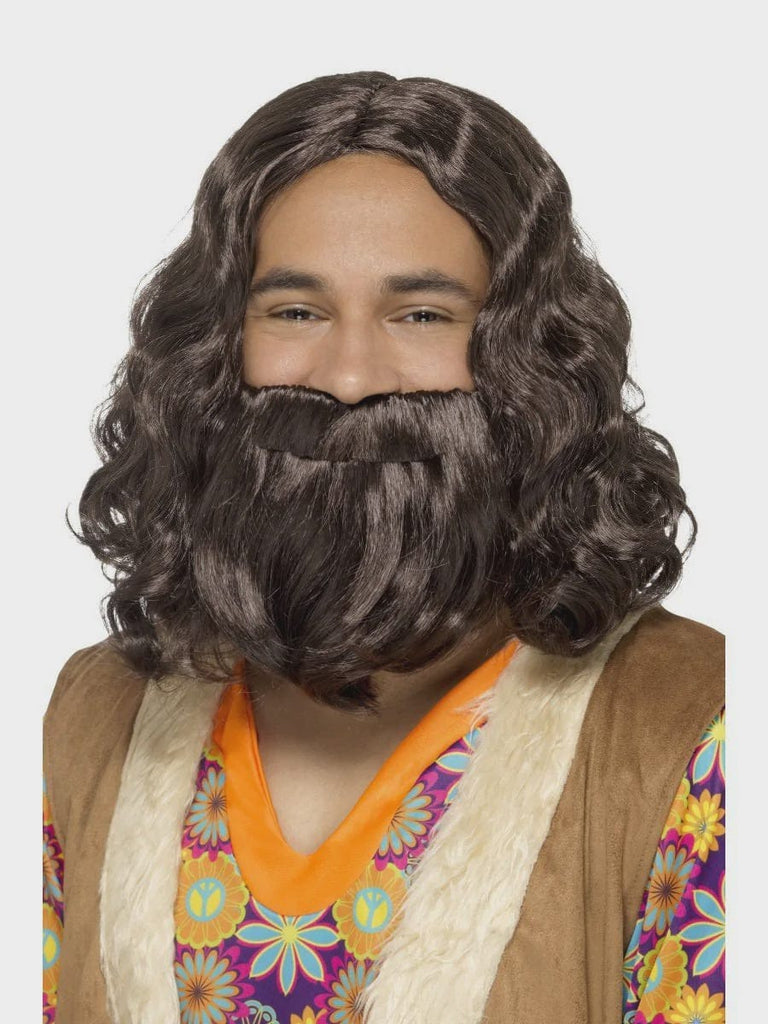 Brown wavy middle part shoulder length wig with beard. Match with our Lennon Glasses for a 60s Hippie look or our Jesus costume for nativity, Christmas or J themed events.