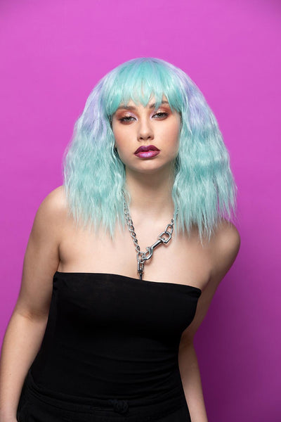 This two-toned light teal and lavender mist coloured Trash Goddess style Manic Panic wig is a mid-length, wavy heat styleable wig with front fringe. This professional quality synthetic wig is heat resistant up to 120 °C.  Manic Panic wigs are cruelty free and vegan.