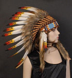 Smaller sized feathered American Indian Headdress with flame colored feathers. This headdress is a halo style war bonnet: it has a brown skull cap which is fully encircled by a series of 34cm white, yellow, orange, red and black feathers set in brown faux fur and faux leather, strung together to sit at an angle. The forehead is embellished with a beaded design with a set of brown discs at each temple. From the discs dangle feathers and faux fur tendrils that hang 33cm in length. Handmade and of exceptional quality, this is a standout fancy dress accessory for Western themed events and music festivals, or simply as something lovely to own.