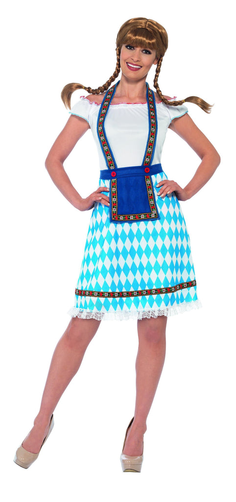 Oktoberfest Beer Maid costume in the traditional colours of the Bavarian flag with alpine floral trim on apron. This is an stretch dress that is also perfect for men wanting to dress up in drag at Oktoberfest. Off the shoulder dress with separate apron. Wig and all other accessories sold separately.