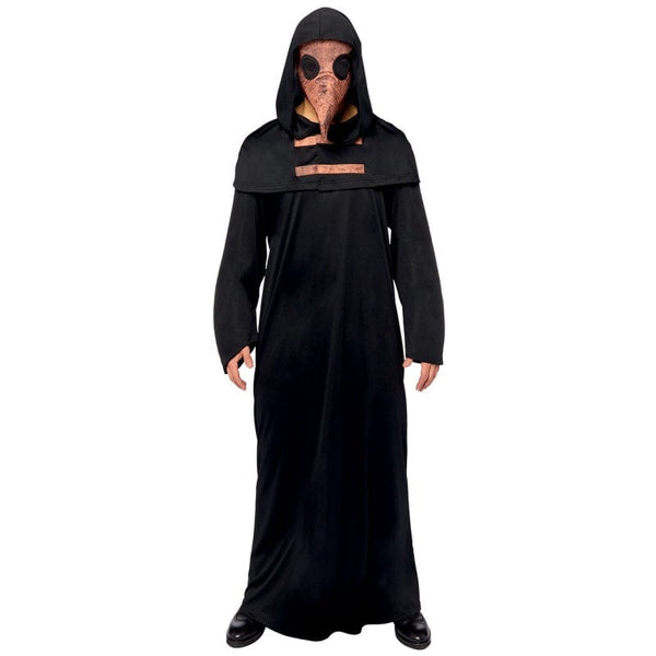 Plague Doctor costume for adults. During the Bubonic Plague, Plague Doctors beame a warning symbol of impeding doom, which makes this costume perfect for scary fun at Halloween. Costume includes long black robe with hooded cape and soft face mask with mesh covered eye holes.