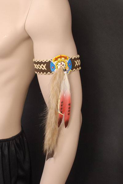 The perfect accessory to go with our Native American Indian Headdresses or as a centerpiece to your American Indian costume. The dark brown leather armband is fully adjustable, at each end are two leather strings that are held together with a bead that slides up and down to tighten on your arm. The armband is decorated with a crisscross design and a disc from which faux fur and two red feathers hang. This item is also available with tan feathers or blue feathers instead of red,