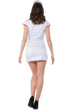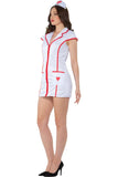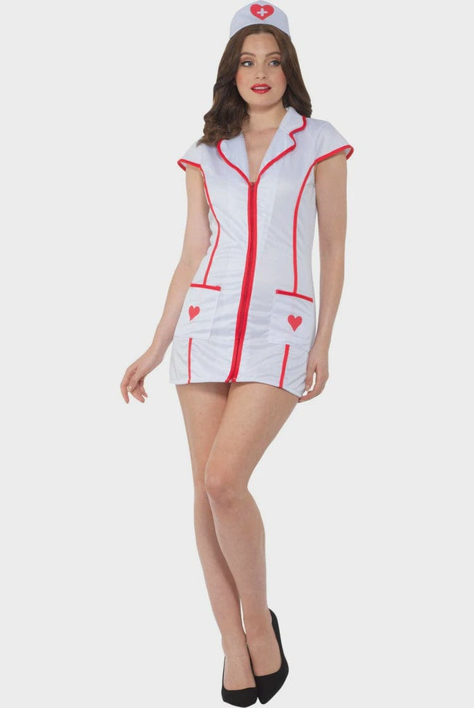 Sexy Nurse Costume for Women includes white stretch mini dress with red trim, red hearts with white crosses. Sexy dress zips up the front and comes with matching headpiece and stethoscope. Perfect for uniform or hero and villain parties. Just add fake blood and wounds at Halloween.