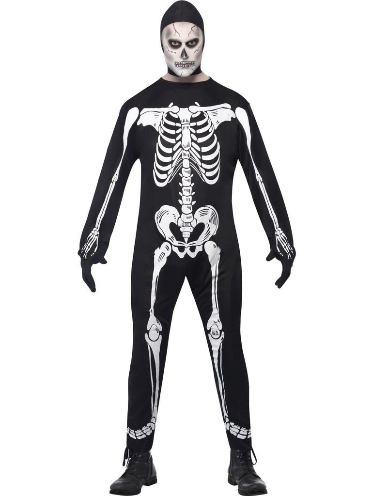 This skeleton Halloween Costume Adult Jumpsuit provides the perfect look for spooky celebrations. The all-black jumpsuit features printed bones and horror-inspired details, while the black hood and gloves add the finishing touches. Make-up sold separately. Perfect for Halloween parties!