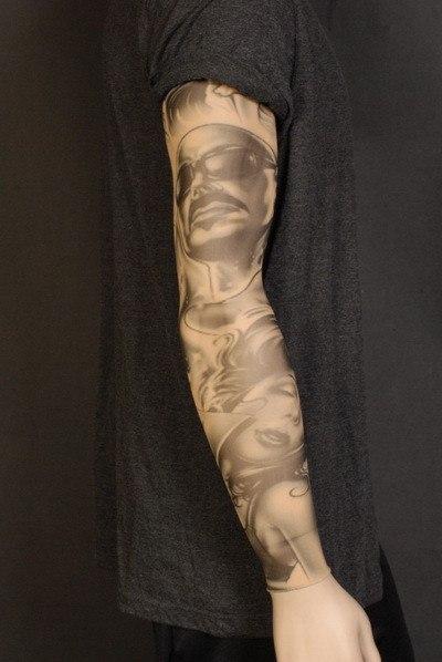 Realistic tattoo sleeve for one arm featuring black and grey portraits of cool people.