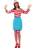Where's Wally costume for ladies. Perfect for teachers at Book Week. Great value costume as it includes everything, including the tights. Complete Where's Wenda costume includes red and white striped top, blue skirt, red and white striped tights, glasses, hat. Where s Wally and Where's Wenda costumes for adults and kids.